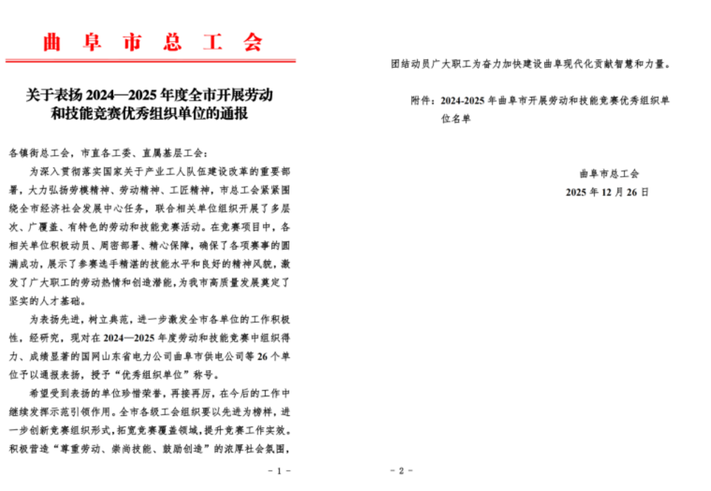 近日,曲阜市总工会发布系列表彰通报,曲阜远东职业技术学院凭借在劳动技能竞赛组织工作中的突出表现及在高技能人才培育领域的显著成效,收获多项荣誉,彰显了学校产教融合、匠心育人的坚实成果。